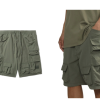A pair of shorts with two large cargo pockets and drawstrings at bottom hem.