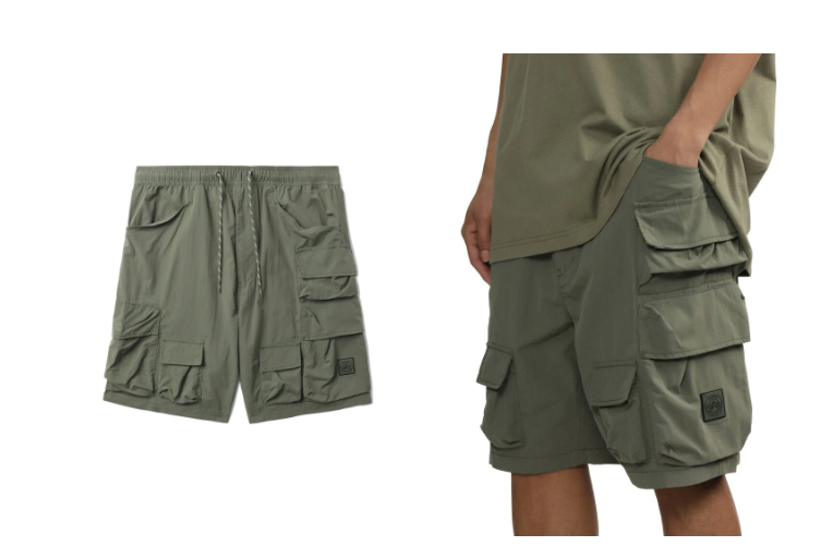 A nylon utility short with adjustable drawstring waist and pockets.